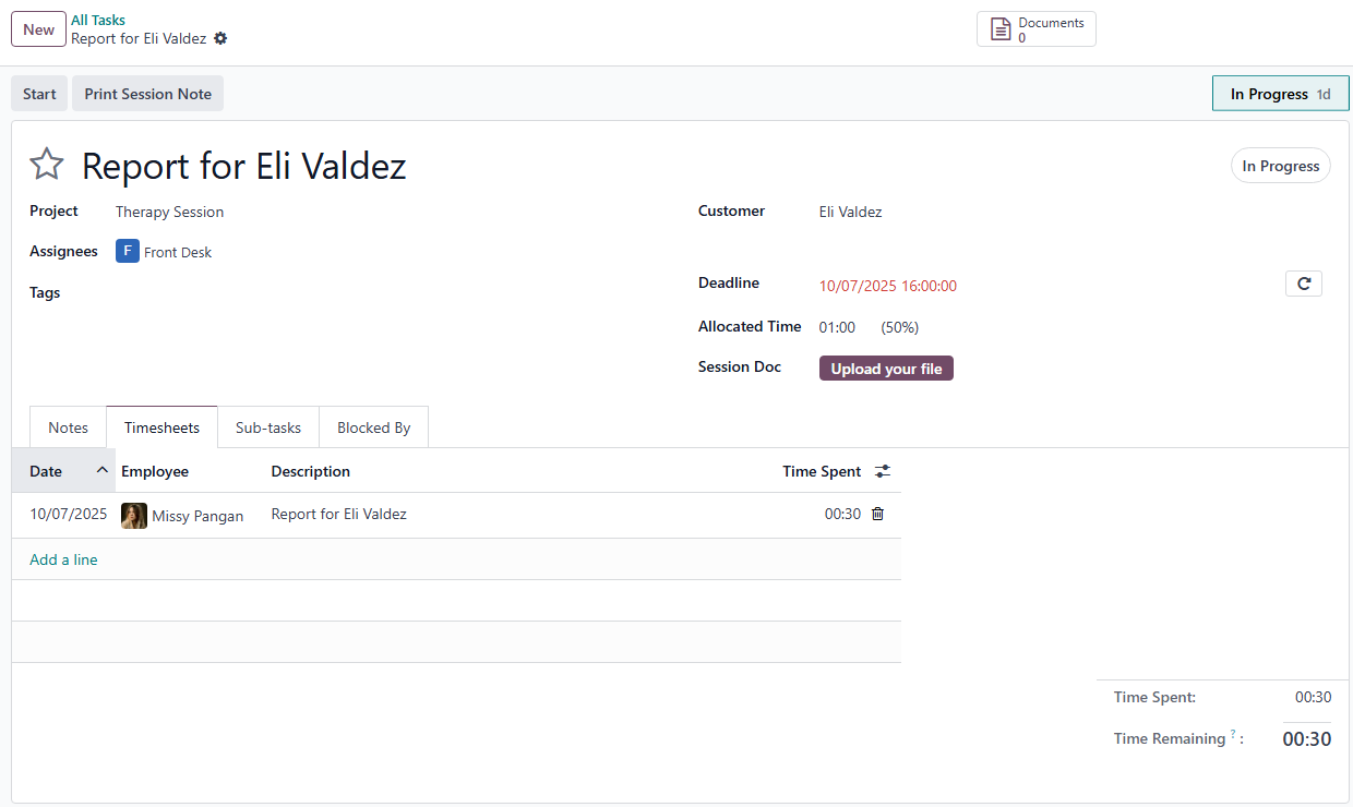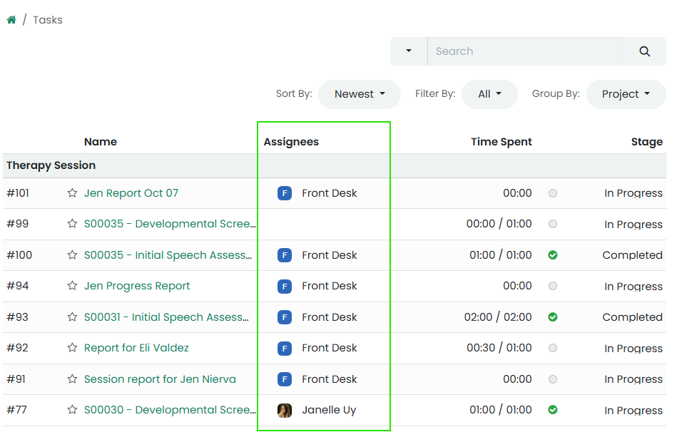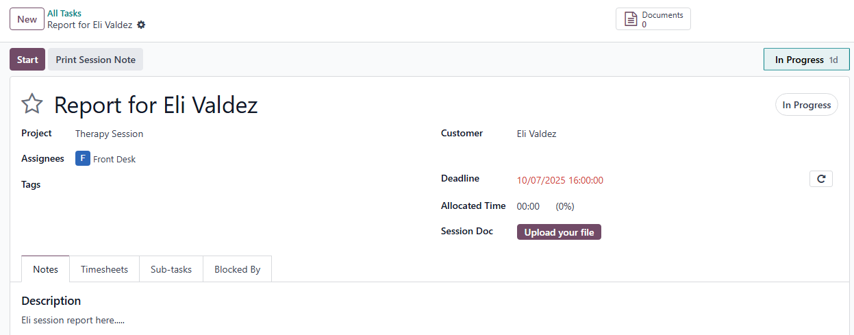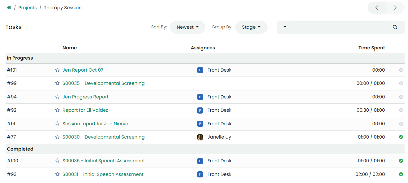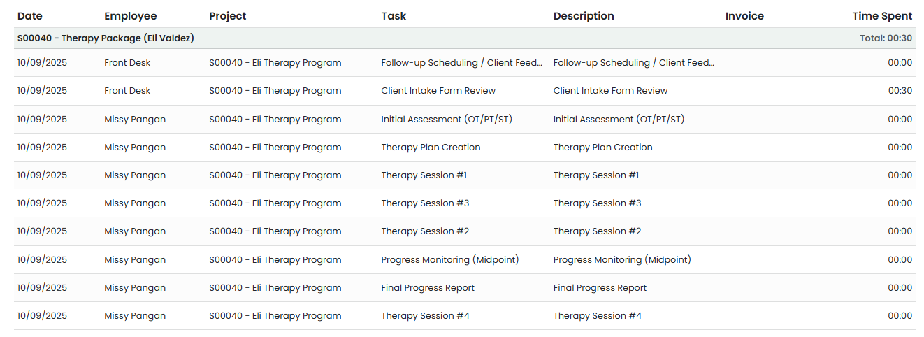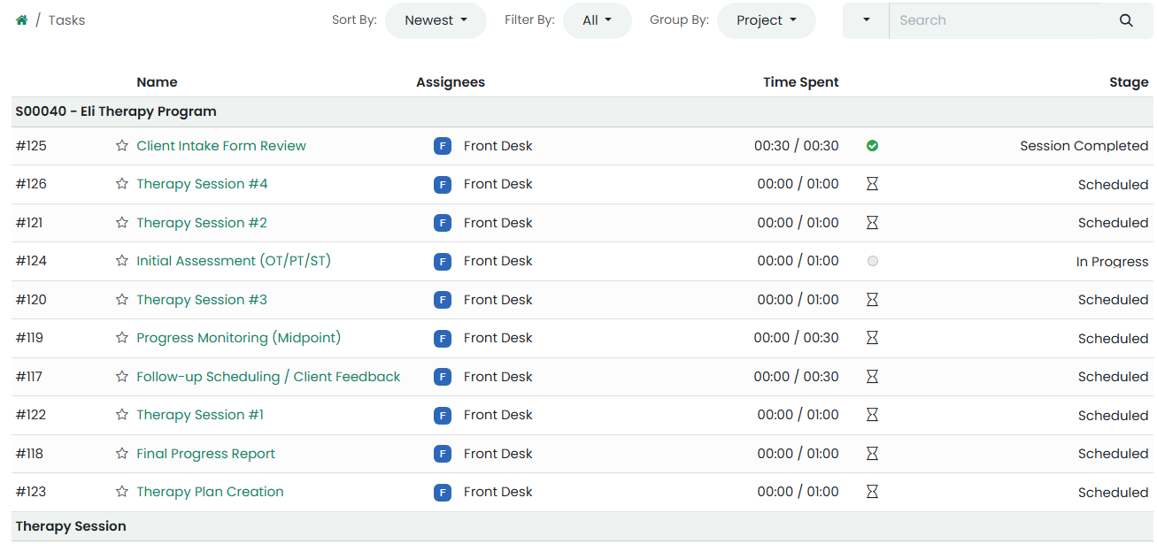 Each therapy session or package is created as a Task under a specific project (e.g., “Occupational Therapy Clients”).