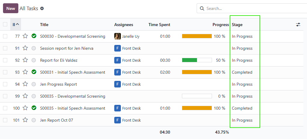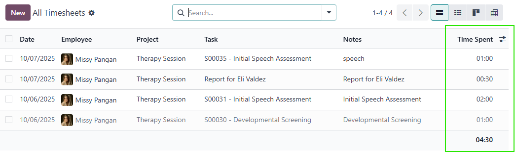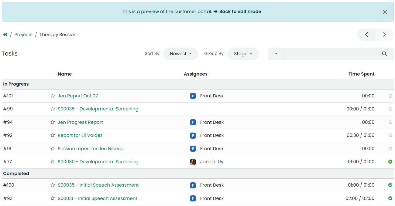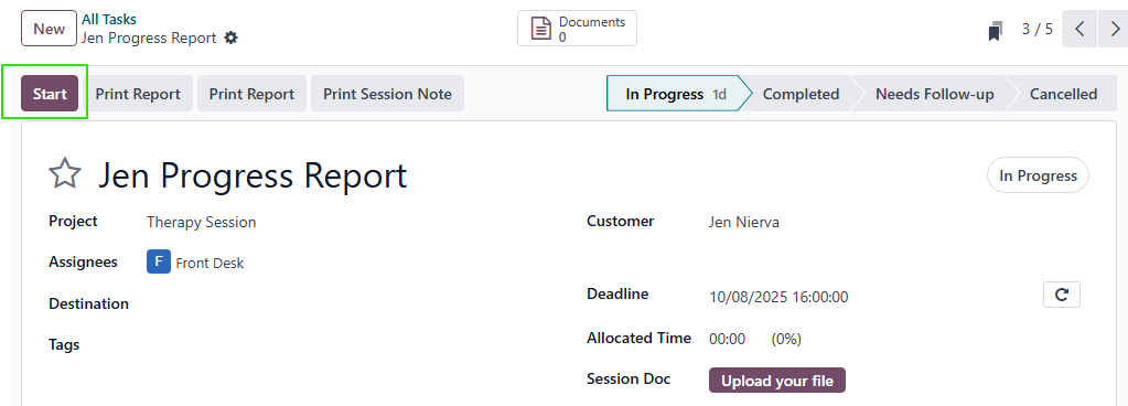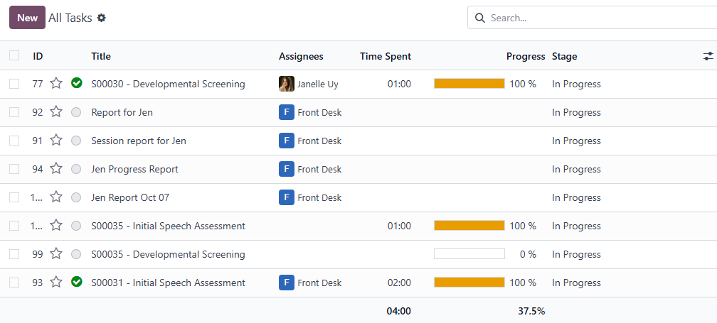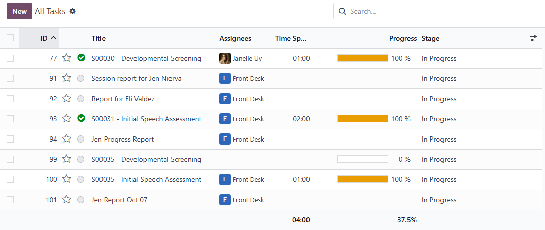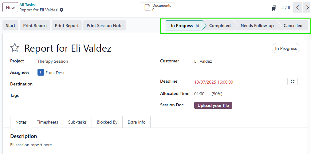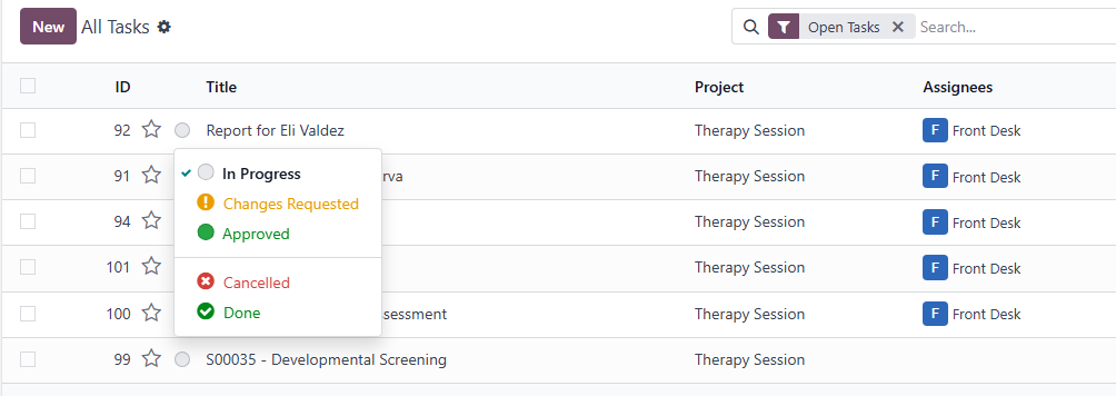 Each therapy session or package is created as a Task under a specific project (e.g., “Occupational Therapy Clients”).