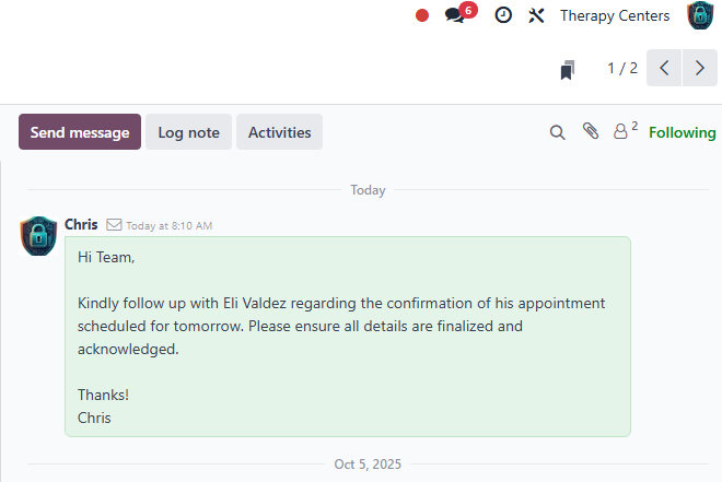 Once confirmed, the system automatically creates a therapy task for scheduling and therapist assignment.