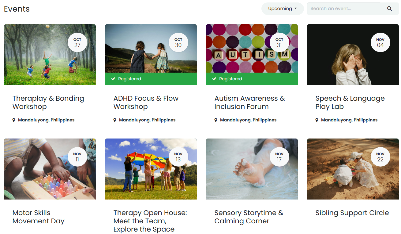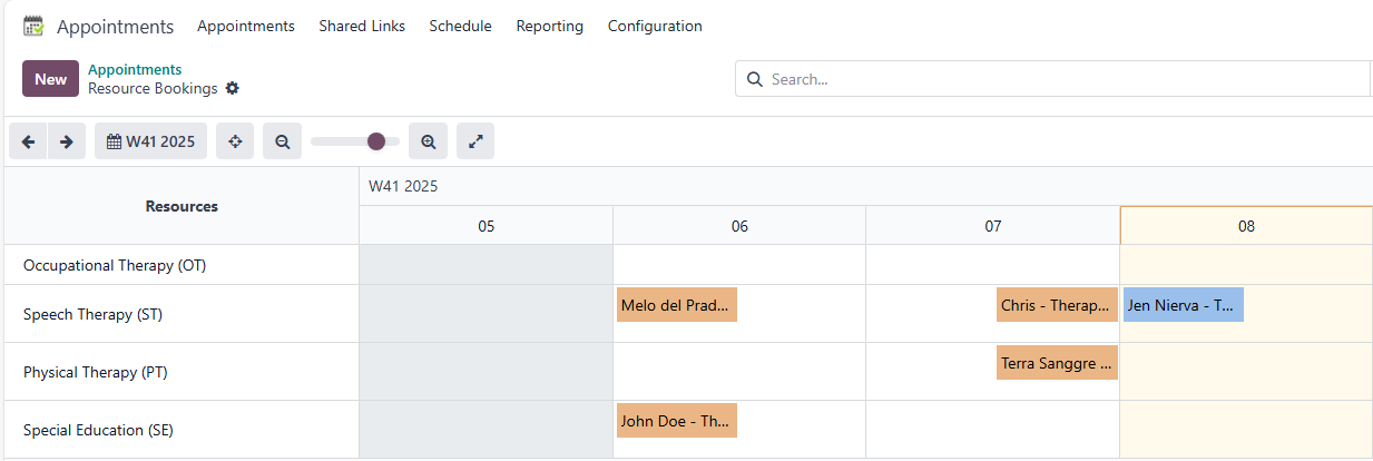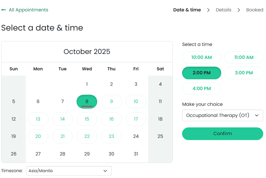 Used for booking client sessions (e.g., Occupational Therapy, Speech Therapy, etc.).