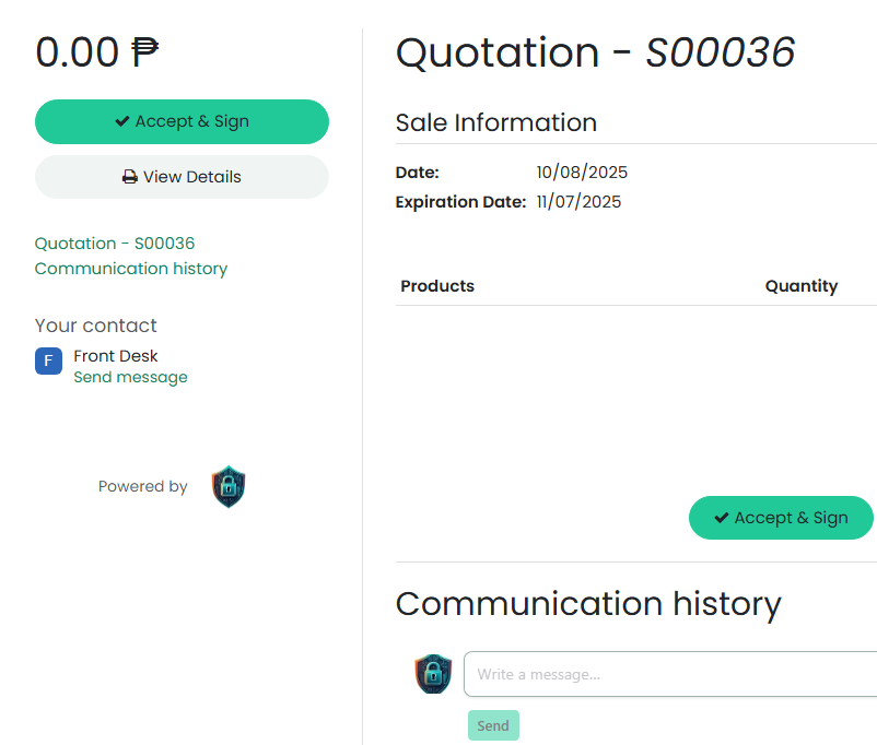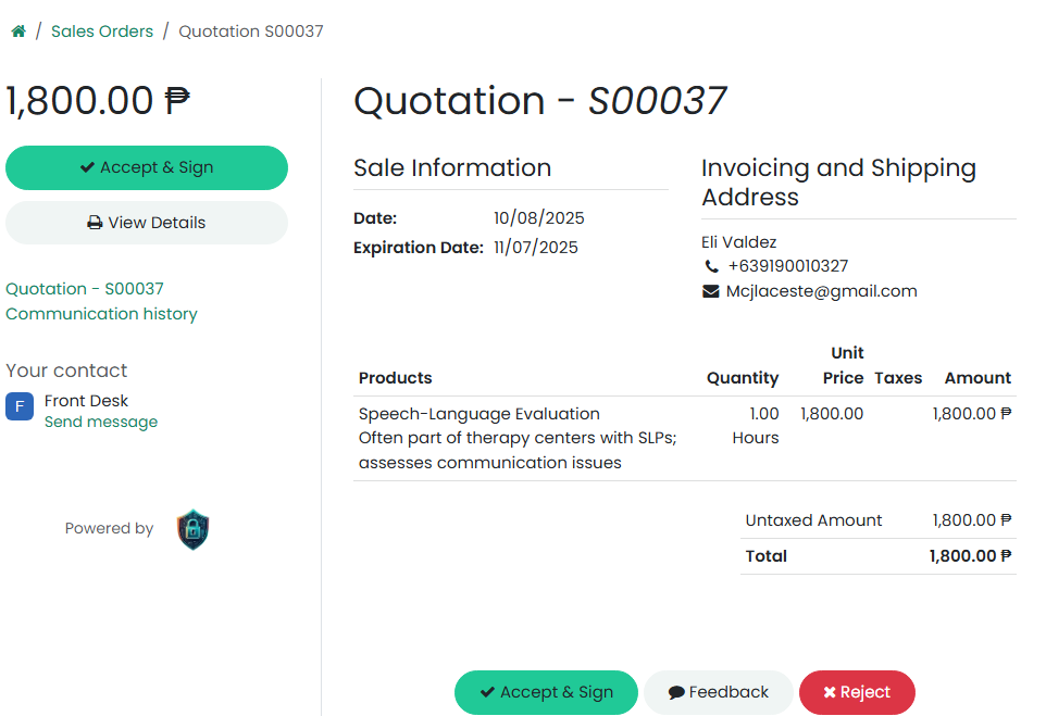 Front desk reviews the booking and sends a quotation for the therapy package.