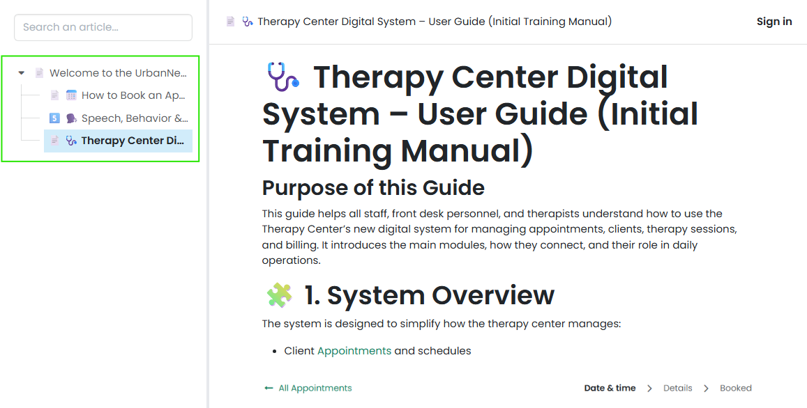 This guide helps all staff, front desk personnel, and therapists understand how to use the Therapy Center’s new digital system for managing appointments, clients, therapy sessions, and billing. It introduces the main modules, how they connect, and their role in daily operations.