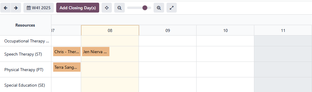 The calendar allows the team to view daily, weekly, and monthly therapy schedules.