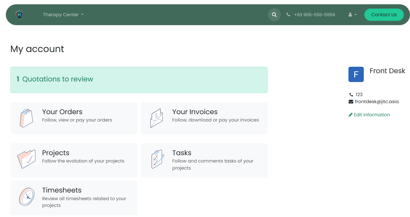 | Front Desk / Admin Staff | Manages client inquiries, schedules appointments, prepares quotations, invoices, and monitors payments. | Access to appointments, client profiles, quotations, invoices, and therapy center tasks. |
